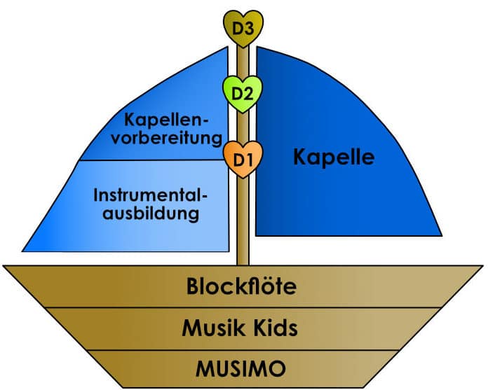 Ist das Instrument im Großen und Ganzen erlernt, startet neben dem Instrumentalunterricht die Kapellenvorbereitung. Gemeinsam mit anderen Schülern werden Grundlagen des Kapellenlebens vermittelt.